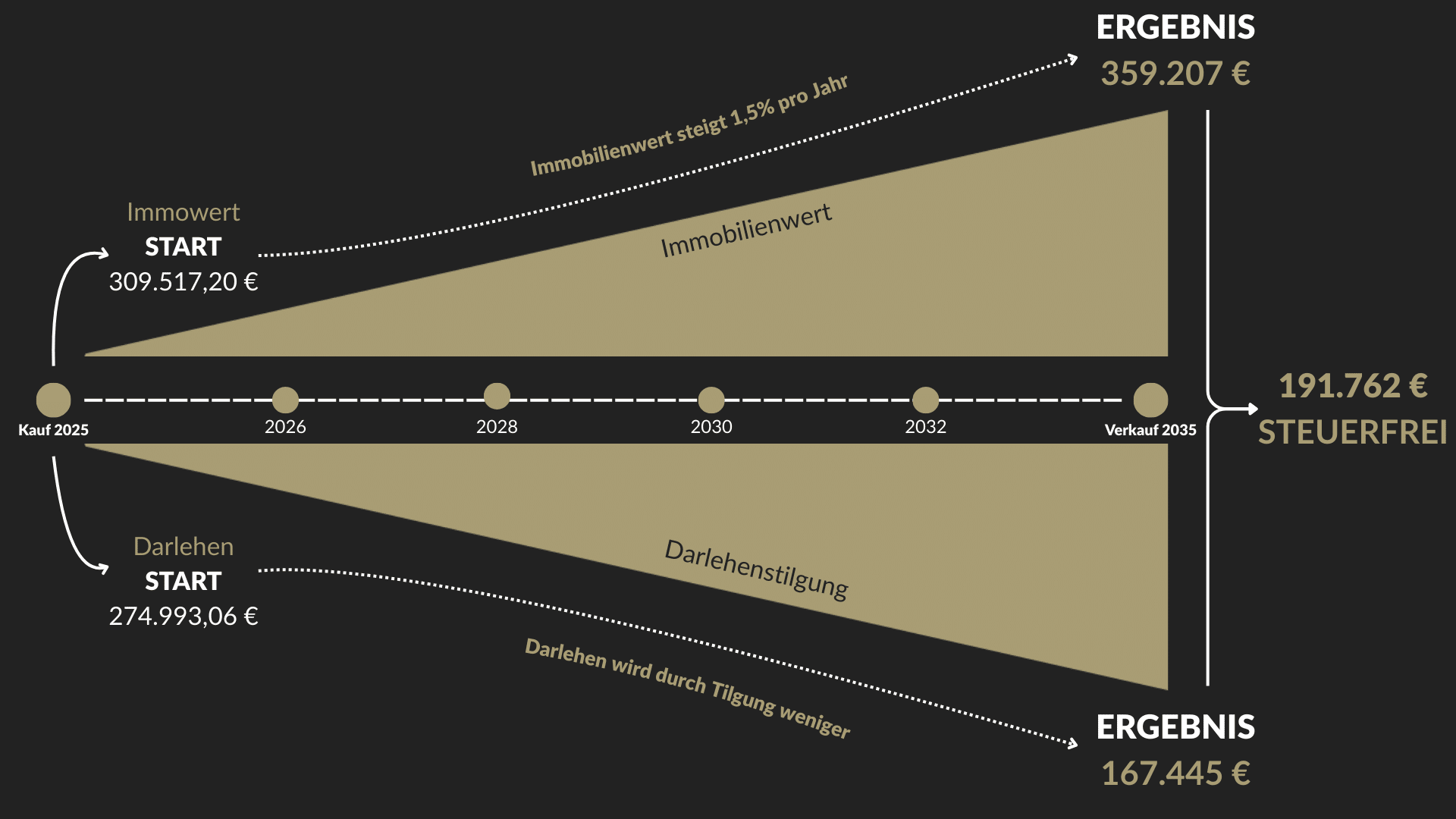 Rund 15 % Eigenkapitalrendite (konservativ kalkuliert). Zusätzlich besteht die Möglichkeit, die Immobilie nach zehn Jahren steuerfrei zu veräußern – in der Beispielrechnung ergibt das einen steuerfreien Bonus von rund 191.762 €
