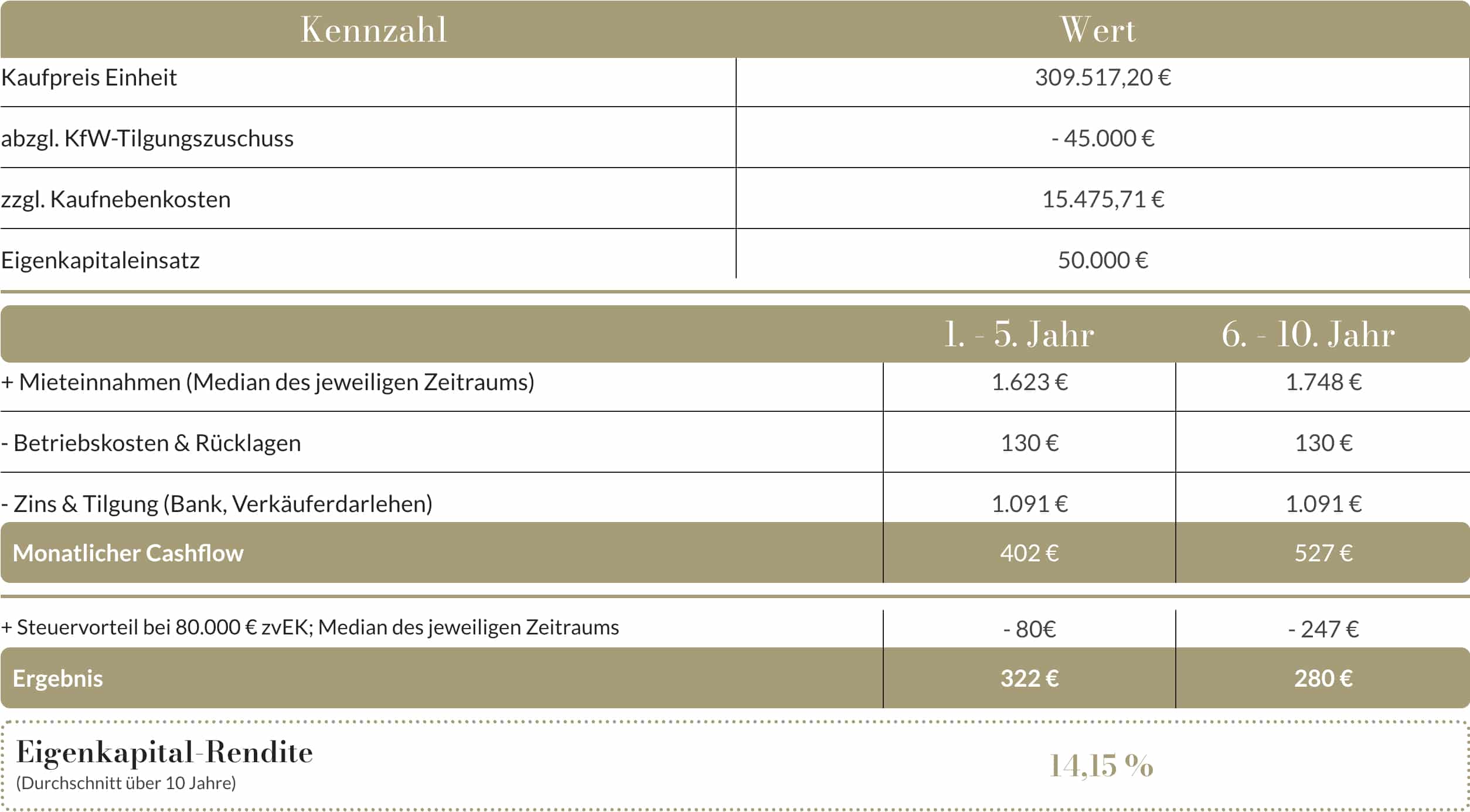 Bei konservativer Berechnung mit einer angenommenen Wertsteigerung von nur 1,5 % pro Jahr ist eine Eigenkapitalrendite von rund 15 % realisierbar. Unter Einbeziehung des KfW-Zuschusses von 45.000 € und einer etwas optimistischeren Einschätzung der Immobilienmarkt-Entwicklung kann die Eigenkapitalrendite deutlich höher liegen.